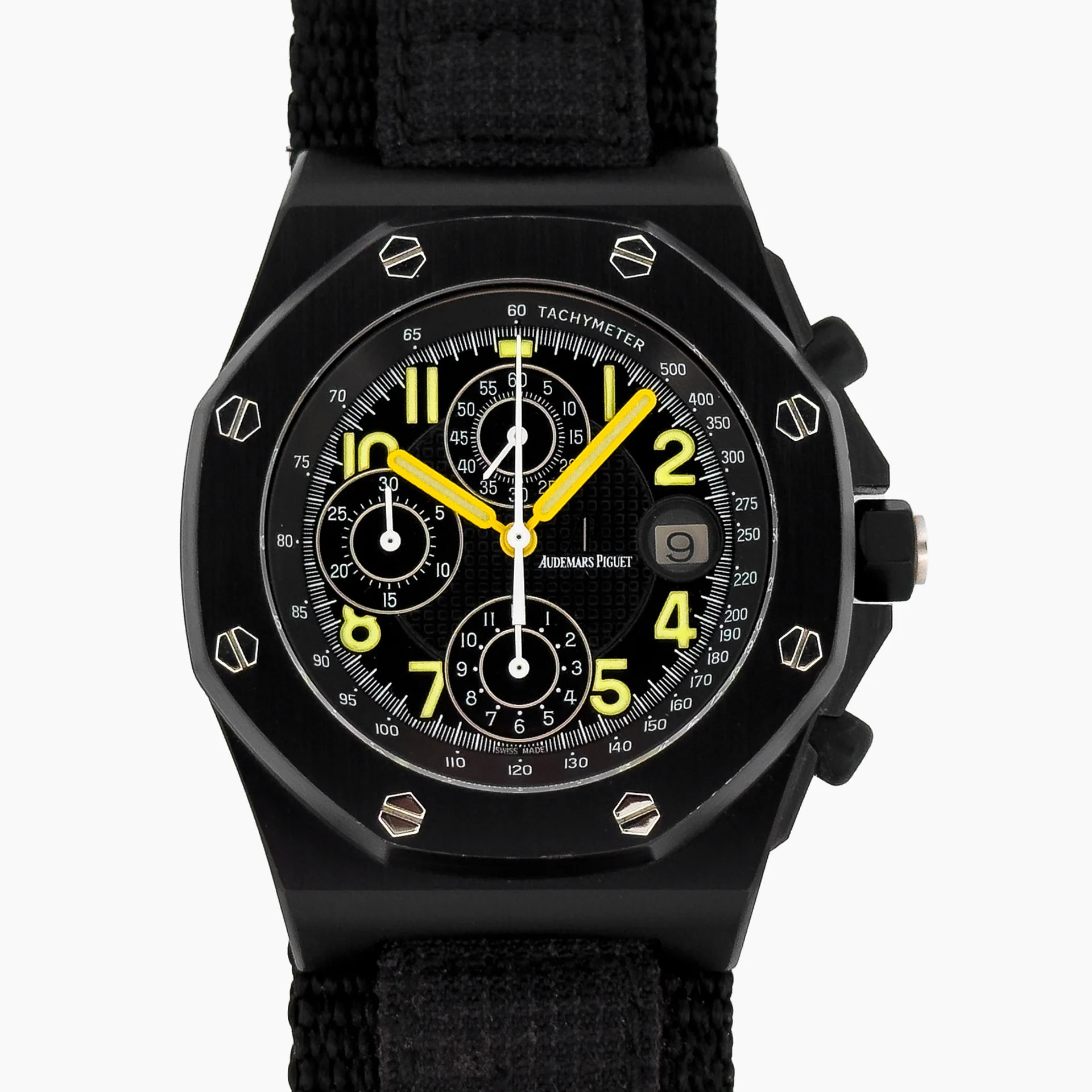 Maker : Audemars Piguet Year : Reference No. : 25770sn Material: Stainless Steel Box / Papers Watch Only Limited Edition 500pcs Condition: Light wear Description Launched in 1997, the limited edition Royal Oak Offshore 25770SN OO A001KE 01 was a collaboration with Arnold Schwarzenegger during the filming of 'End of Days ' This model, one of the earliest PVD-coated watches, is limited to just 500 pieces and includes a black Kevlar strap The 42mm steel case, adorned with black PVD coating, encases a black dial with vibrant yellow Arabic numeral hour markers and hands Additionally, three sub-dials and a circular date window at 3 o’clock enhance its appeal Powered by the caliber 2226/2840 self-winding movement, the watch offers a 42-hour power reserve This pre-owned Audemars Piguet Royal Oak Offshore “End of Days” Limited Edition Watch 25770SN OO A001KE 01 is accompanied by papers and a gift box
