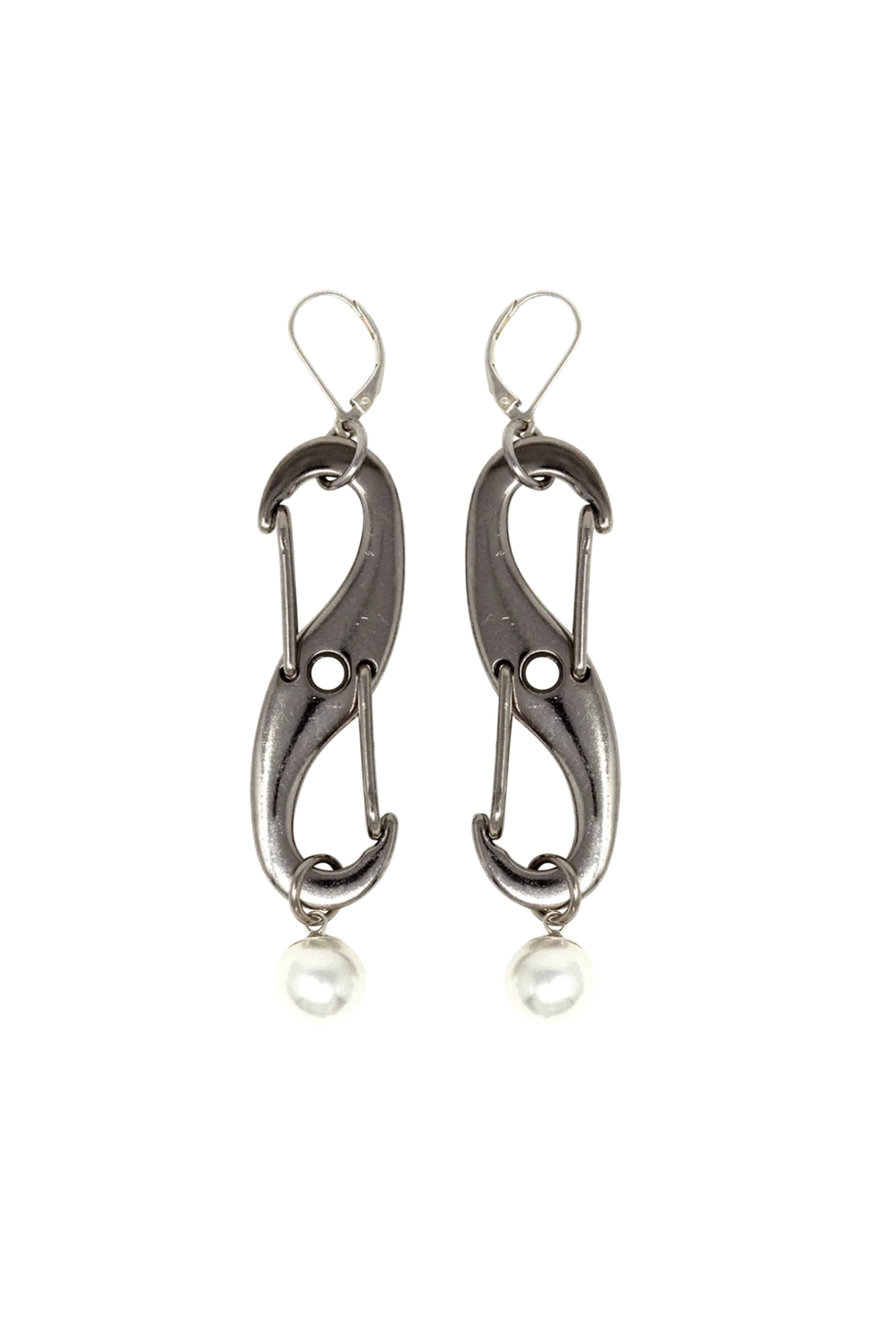 Pair of leverback french earrings in silver-tone metal. Infinity shaped S-Biner body, faux-Pearl pendant at drop. Hinged-post fastening. MADE IN NEW YORK DETAILS Length : 2.5" (excluding hooks) Hooks : Sterling Silver Body : Metal Zinc Alloy