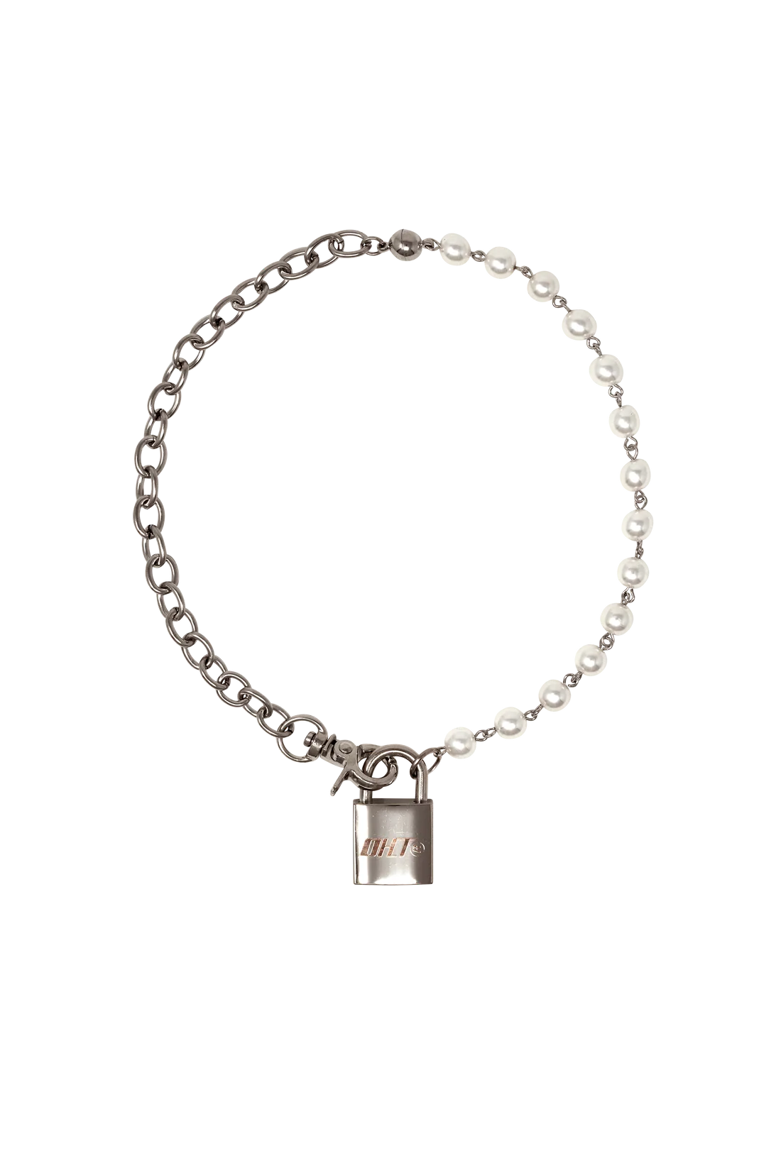 Mixed-chain in silver-coated metal and faux pearl. Rose-gold color logo engraved padlock pendant at drop. Keyring hardware and round brass magnetic clasp fastening. Extended size available. MADE IN NEW YORK COLOR Silver DETAILS Chain and Keyring Length : 15.5" Padlock Diameter : .75" Body : 304 Stainless Steel, Brass.