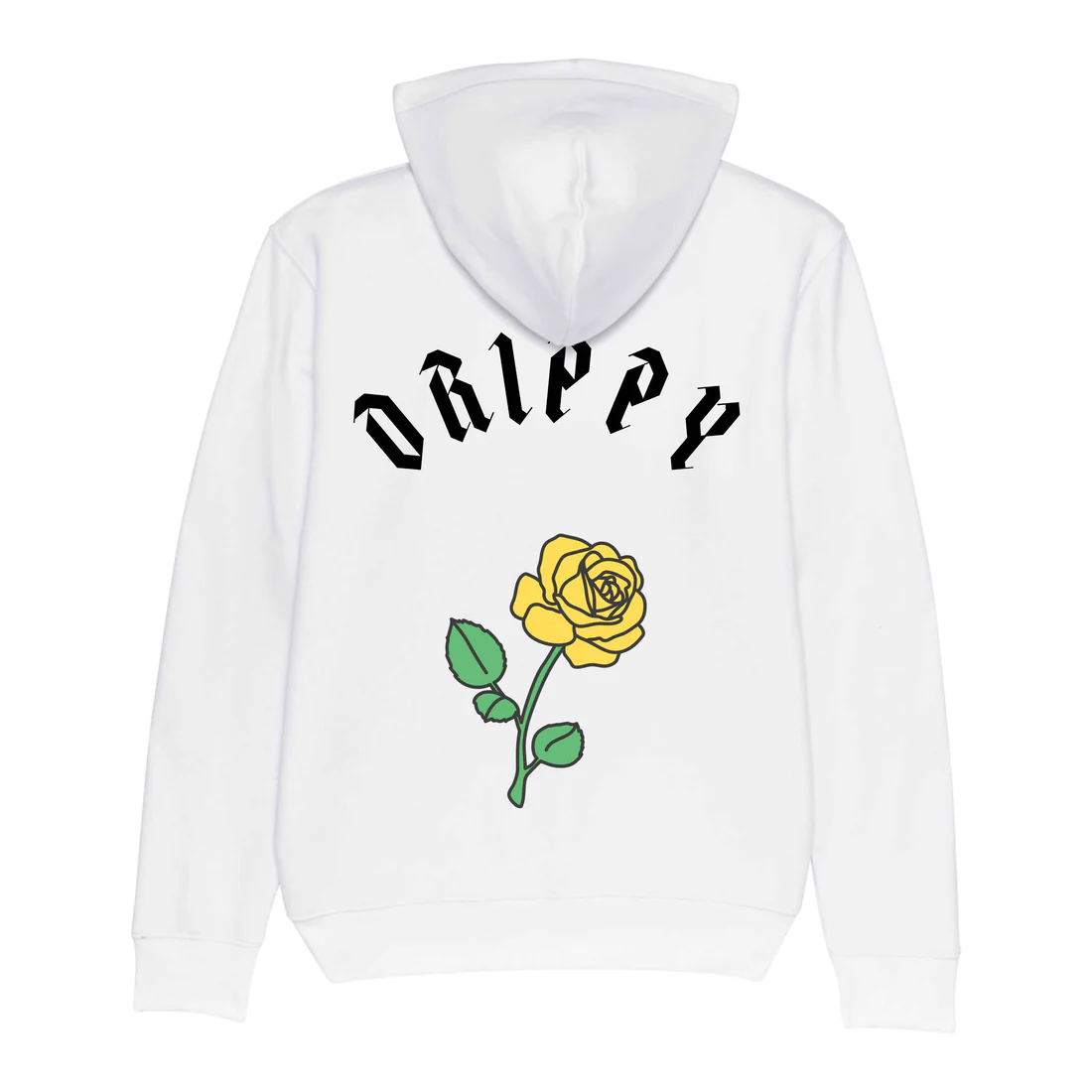 Stay comfy and stylish with Drippy Milano's cotton-blend hoodie in white with a yellow rose. Get the perfect fit with our size recommendations and enjoy the super soft, environmentally friendly fabric. Shop now.